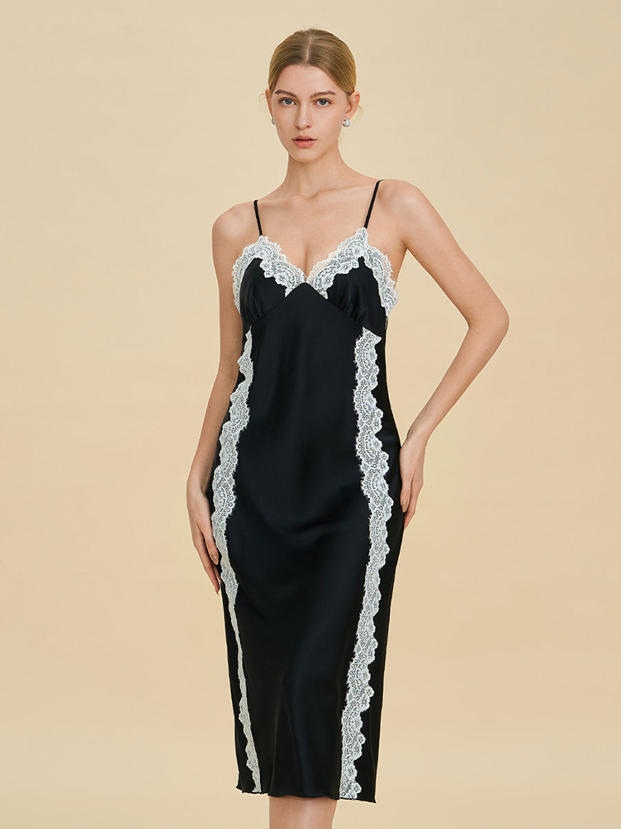 Black Asymmetric Lace Satin Midi Slip Dress